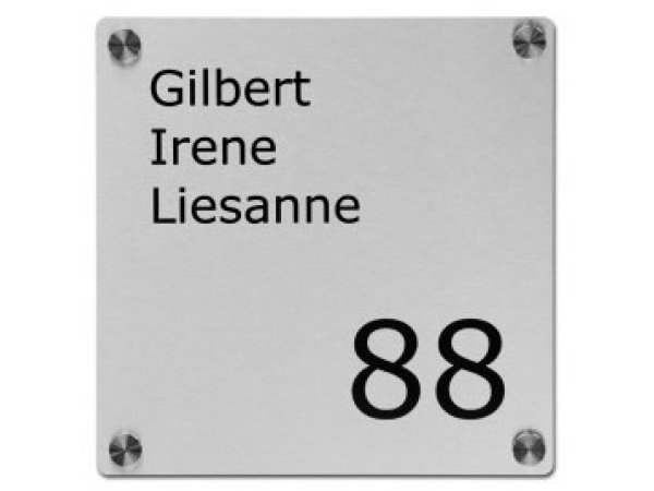 Dit rvs naambord heeft een afmeting van 20 x 20 cm en biedt voldoende ruimte voor het plaatsen van een huisnummer, namen en achternamen. Met de moderne ontwerpmodule maak je zelf het ontwerp van je rvs naambord helemaal naar wens.