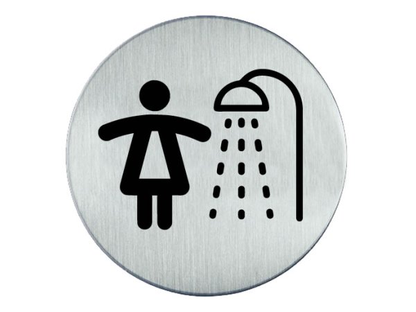 Dit rvs pictogram Douche dames is voorzien van een duidelijk symbool met een douche en een vrouw. Het geeft aan dat doucheruimte voor dames bedoelt is.