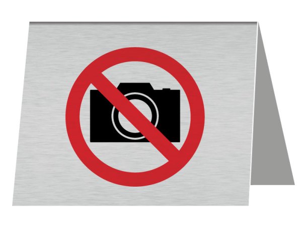 Tafelbordje / baliebordje Fotograferen verboden. Dit mooie Aluminium bordje heeft een afmeting van 10 x 7,5 cm. Het bordje wordt gemaakt van Aluminium met een fijne geborstelde rvs structuur. Na het bedrukken wordt het bordje in een V vorm gebogen zodat het makkelijk op een tafel of balie kan staan.