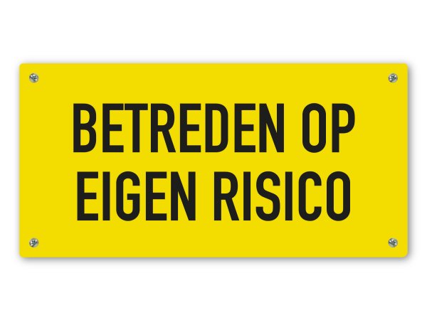 Dit gele tekstbord met "Betreden op eigen risicio" wordt vaak gebruikt op een terrein om aan te geven dat je niet aansprakelijk bent voor eventuele gevolgen van het betreden van het terrein.
