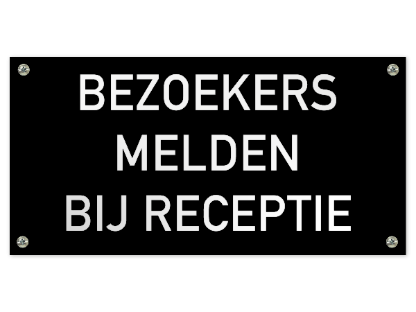 Dit kunststof tekstbord is voorzien van de tekst "Bezoekers melden bij receptie". Dit tekstbord is verkrijgbaar in 7 kleuren, 4 afmetingen en 3 bevestigingsmethodes.