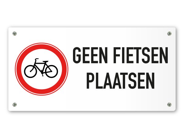 Dit witte tekstbord is voorzien van de tekst "Geen fietsen plaatsen". Daarnaast versterkt het pictogram de boodschap dat er geen fietsen geplaatst mogen worden. Je kan dit verbodsbord op verschillende plekken inzetten. In veel gevallen zal het gaan om situtaties waarbij geparkeerde fietsen zorgen voor overlast of gevaarlijke situaties. Je zorgt er met dit bord voor dat fietsen elders worden geplaatst en minder snel een gevaar vormen.