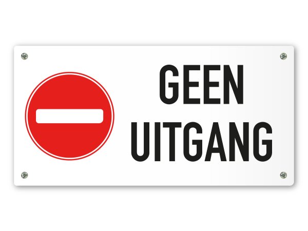 Dit tekstbord heeft een duidelijk boodschap en dat is aangeven dat dit geen uitgang is. Het is voorzien van de tekst "Geen uitgang" en een verbodsteken om mensen heel duidelijk aan te geven dat dit geen uitgang is. Het wordt gebruikt bij nooddeuren of deuren die naar prive ruimte gaan. Dit bordje kan heel handig op een deur worden bevestigd.