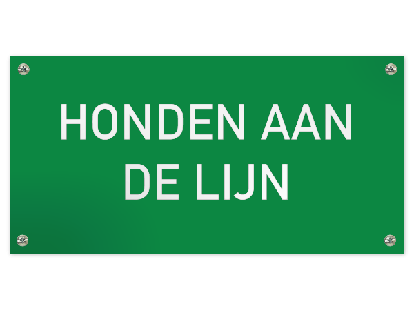 Dit kunststof tekstbord is voorzien van de tekst "Honden aan de lijn". Dit tekstbord is verkrijgbaar in 7 kleuren4 afmetingen en 3 bevestigingsmethoden.