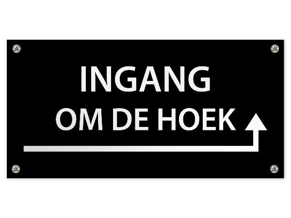 Dit kunststof tekstbord is voorzien van de tekst "Ingang om de hoek" en een pijl naar rechts om de hoek. Dit tekstbord is verkrijgbaar in 7 kleuren, 4 afmetingen en 3 bevestigingsmethoden.