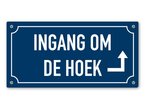Sommige woningen of bedrijven hebben een ingang die aan de zijkant is gelegen. Om bezoekers de juiste richting op te wijzen hebben we een tekstbord "Ingang om de hoek" met een pijl naar rechts gemaakt. Zo voorkom je verwarring of dat bezoekers aan de verkeerde deur staan. De pijl naar rechts geeft ook aan welke richting de ingang op is.