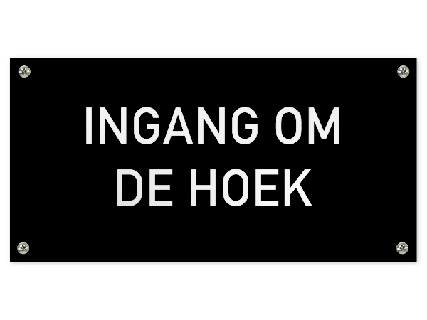 Dit kunststof tekstbord is voorzien van de tekst "Ingang om de hoek". Dit tekstbord is verkrijgbaar in 7 kleuren, 4 afmetingen en 3 bevestigingsmethoden.