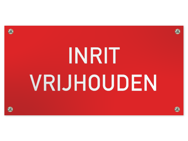 Dit kunststof tekstbord is voorzien van de tekst "Inrit vrijhouden". Dit tekstbord is verkrijgbaar in 7 kleuren, 4 afmetingen en 3 bevestigingsmethoden.