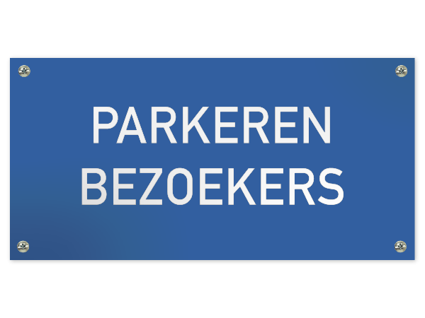 Dit kunststof tekstbord is voorzien van de tekst "Parkeren bezoekers". Dit tekstbord is verkrijgbaar in 7 kleuren, 4 afmetingen en 3 bevestigingsmethoden.
