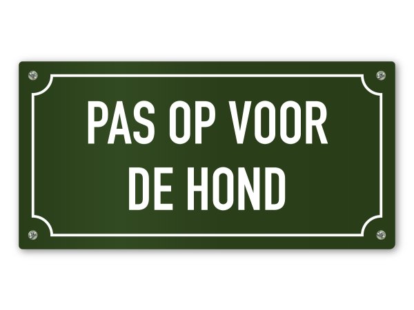 Wanneer je een (waak)hond op je terrein hebt rondlopen, kan het handig zijn om bezoekers te waarschuwen. We bieden daarom dit tekstbord "Pas op voor de hond". Hierdoor heeft het tekstbord een waarschuwende en afschrikkende functie. Het is overigens niet verplicht om een waarschuwingsbord te plaatsen wanneer er een hond rondloopt. Dit bord heeft een subtiele groene kleur en een sierlijk kader.