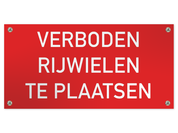 Dit kunststof tekstbord is voorzien van de tekst "Verboden rijwielen te plaatsen". Dit tekstbord is verkrijgbaar in 7 kleuren, 4 afmetingen en 3 bevestigingsmethoden.