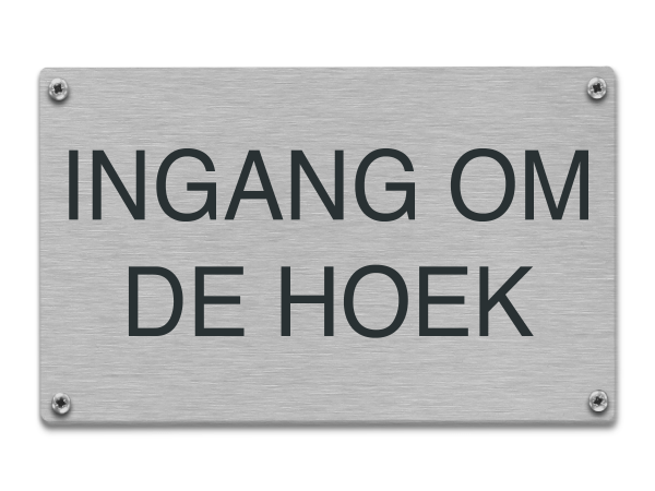 We maken dit tekstbord van rvs en de opdruk Ingang om de hoek wordt gegraveerd. Zo is de opdruk permanent en niet gevoelig voor weersomstandigheden.