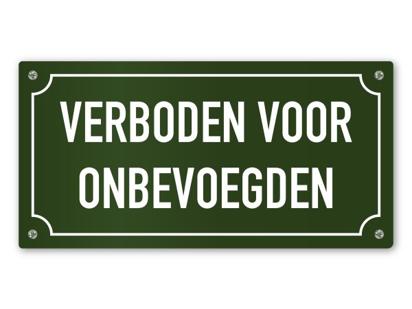 Dit sierlijke groene tekstbord Verboden voor onbevoegden helpt je om bijvoorbeeld ongewenste bezoekers op je terrein tegen te houden. Het geeft duidelijk en stijlvol een duidelijke de boodschap door dat het verboden is voor onbevoegden.