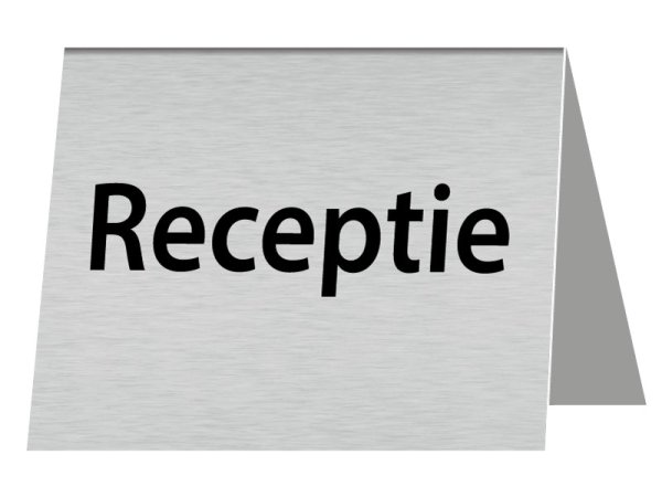 Tafelbordje / baliebordje Receptie. Dit mooie Aluminium bordje heeft een afmeting van 10 x 7,5 cm. Het bordje wordt gemaakt van Aluminium met een fijne geborstelde rvs structuur. Na het bedrukken wordt het bordje in een V vorm gebogen zodat het makkelijk op een tafel of balie kan staan.