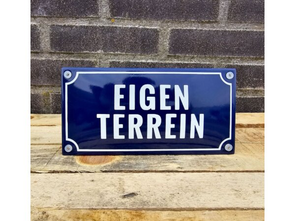 Wilt u duidelijk aangeven dat een terrein privé is? Dit stijlvolle emaille tekstbord met de tekst “Eigen Terrein” is de perfecte oplossing. Met zijn klassieke uitstraling en ambachtelijke afwerking biedt dit bord niet alleen een duidelijke boodschap, maar is het een sterk tekstbord dat jaren mooi blijft.