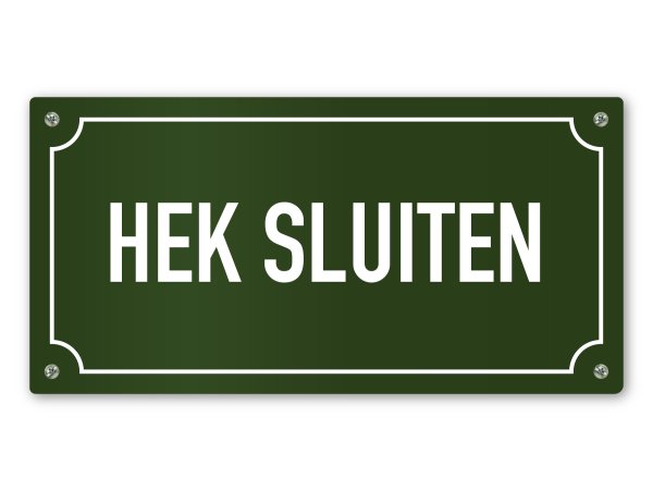 Met dit bordje vraag je bezoekers om het hek te sluiten. Dat kan handig zijn wanneer je bijvoorbeeld je erf altijd moet worden afgesloten. Dit kan bijvoorbeeld zijn in verband met kinderen of dieren zoals honden of kippen. Dit tekstbord is dan ook voorzien van de tekst "Hek sluiten". Door de groene kleur en het sierkader is het tekstbord subtiel en niet overheersend of schreewerig. Met dit tekstbord verzoek je vriendelijk om het het te sluiten na vertrek of aankomst.