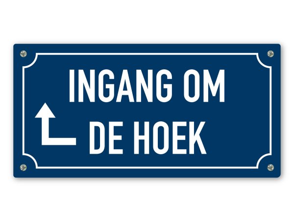 Sommige woningen of bedrijven hebben een ingang die aan de zijkant is gelegen. Om bezoekers de juiste richting op te wijzen hebben we een tekstbord "Ingang om de hoek" met een pijl naar links gemaakt. Zo voorkom je verwarring of dat bezoekers aan de verkeerde deur staan. De pijl naar links geeft ook aan welke richting de ingang op is.