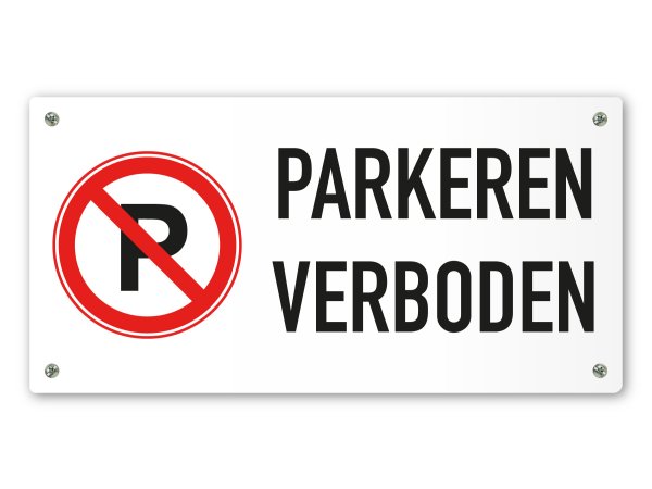Dit tekstbord "Parkeren verboden" is voorzien van de tekst parkeren verboden en een pictogram parkeerverbod. Met dit bordje maak je duiddelijk dat er op de betreffende plaats niet geparkeerd mag worden. Een handig bordje om bijvoorbeeld te plaatsen op een plek waar geparkeerde auto's of (brom) fietsen kunnen zorgen voor een gevaarlijke situatie.
