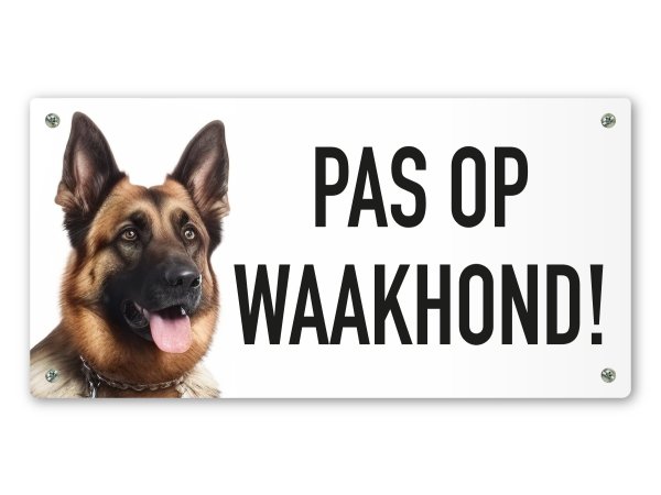 Dit waakbordje is voorzien van afbeelding van een Duitse Herdershond met de tekst "Pas op waakhond". Het bordje heeft hiermee een duidelijke boodschap en heeft vooral een afschrikkende werking.