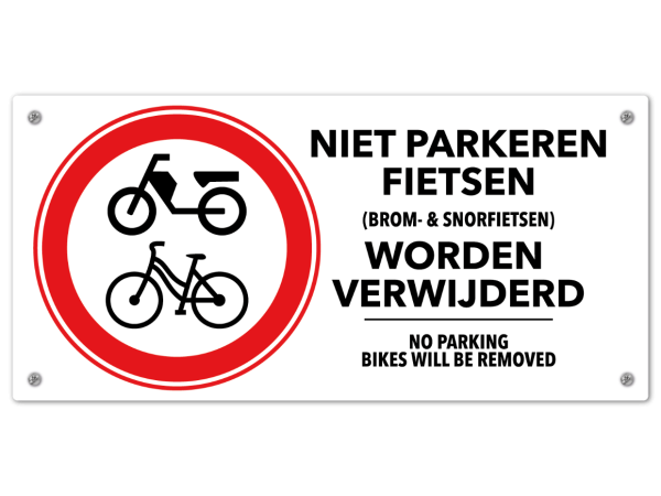 Dit tekstbord is de perfecte oplossing wanneer je last hebt van verkeerd geparkeerde fietsen, brom- of snorfietsen. Dit bordje met de tekst "Niet Parkeren - Fietsen (brom- & snorfietsen) worden verwijderd" geeft een duidelijke waarschuwing. Het tekstbord is voorzien van een duidelijk symbool met zowel een fiets als een snorfiets.
