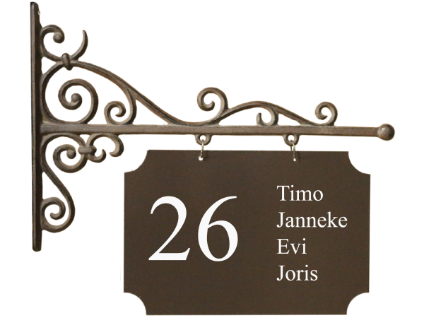 Gietijzer is een herkenbaar materiaal met een geheel eigen karakter. Het is een staalsoort dat gegoten wordt. Het is weerbestendig, sterk en vraagt geen onderhoud. Het is geschikt voor verschillende toepassingen. Of je nou een winkel, bed en breakfast hebt of een naambord bij je voordeur zoekt. Je kan het onderbord voorzien van je naam, huisnummer of openingstijden. Op verzoek kunnen we zelfs een logo aanbrengen.
